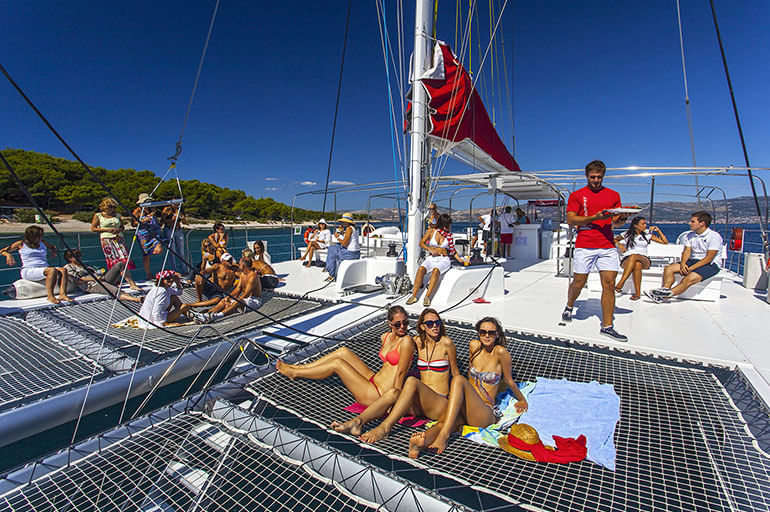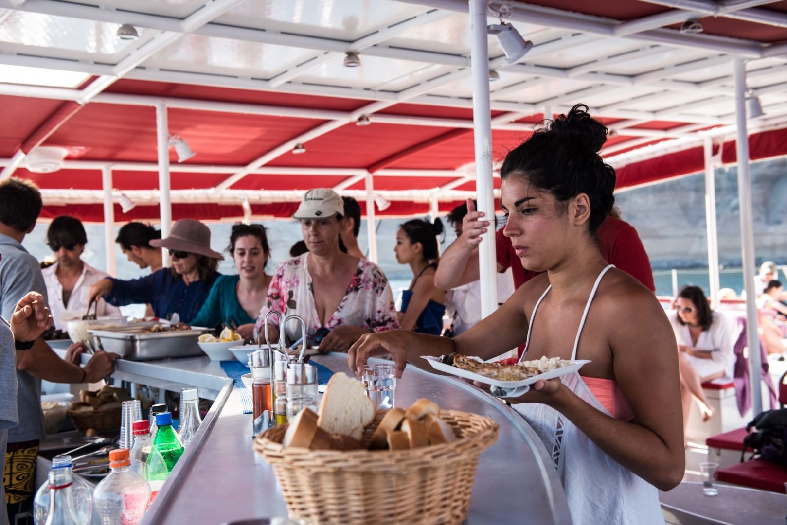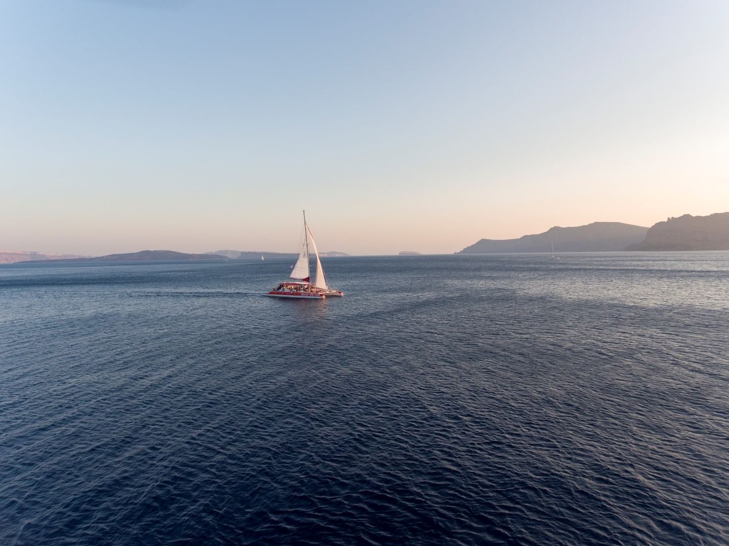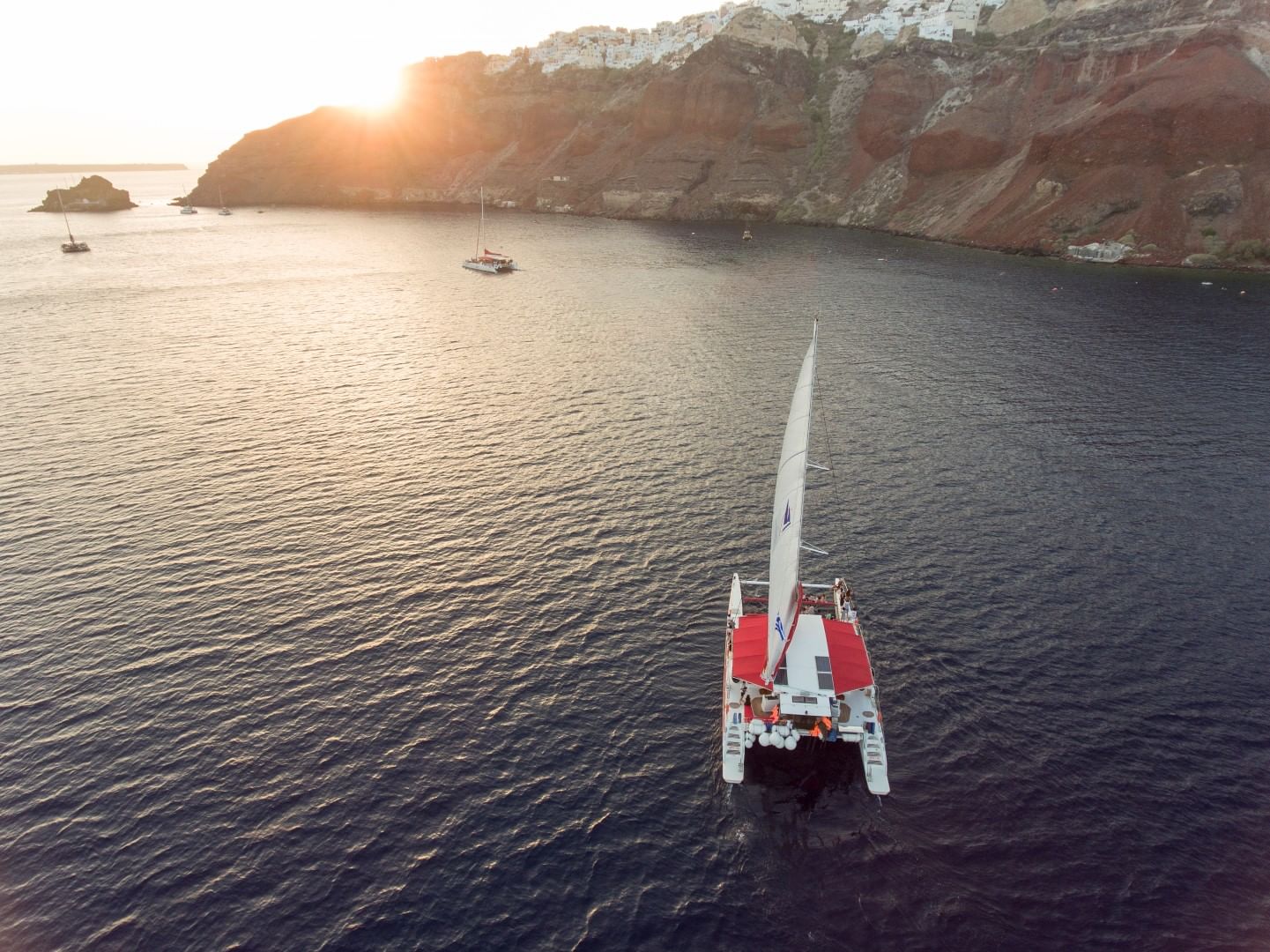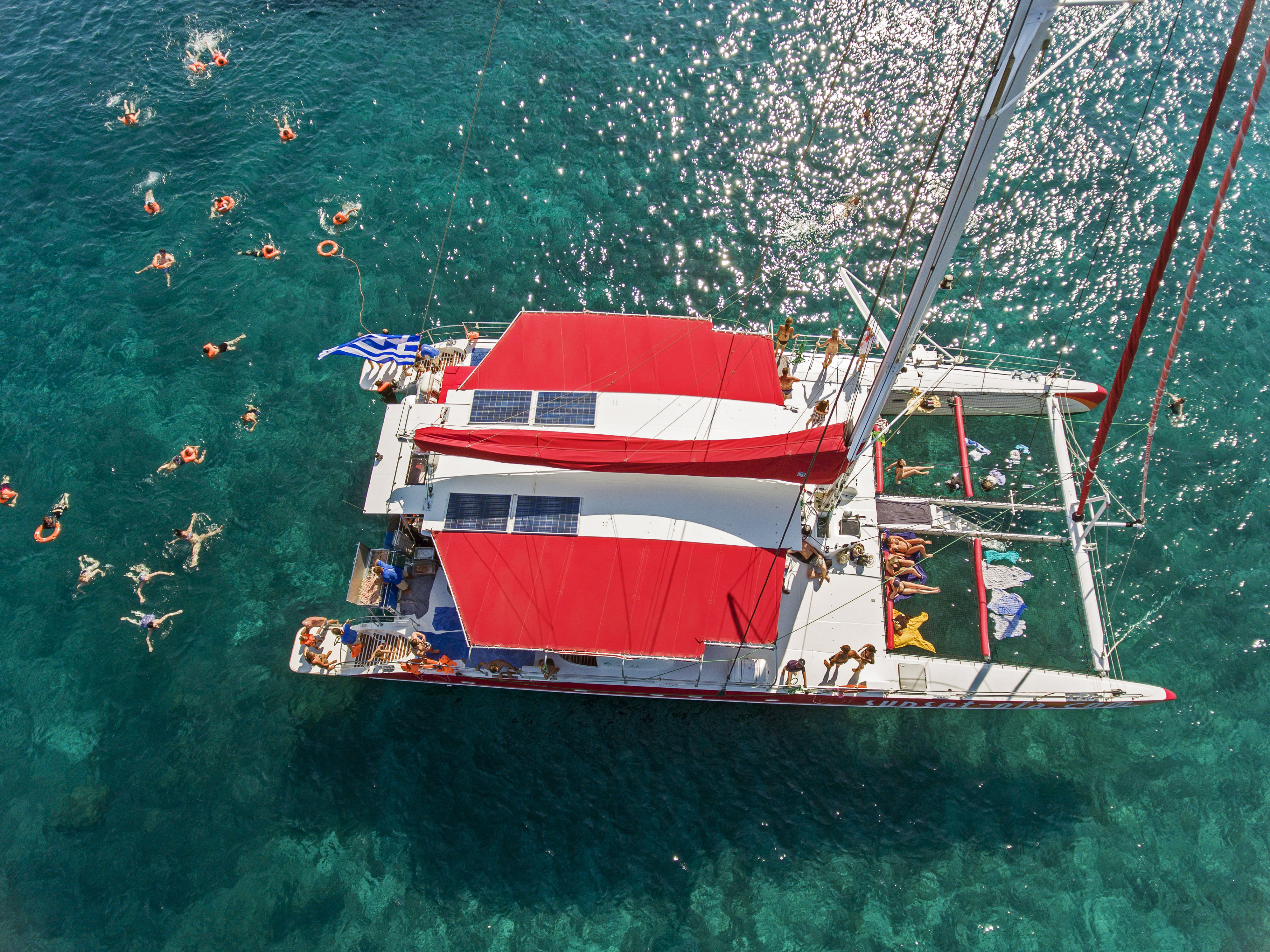 Get picked up from your hotel to go enjoy a 5-hour cruise on a catamaran around the amazing Caldera of Santorini. Swim and snorkel in the crystal deep blue waters of the Aegean Sea and enjoy a delicious barbecue prepared on board.