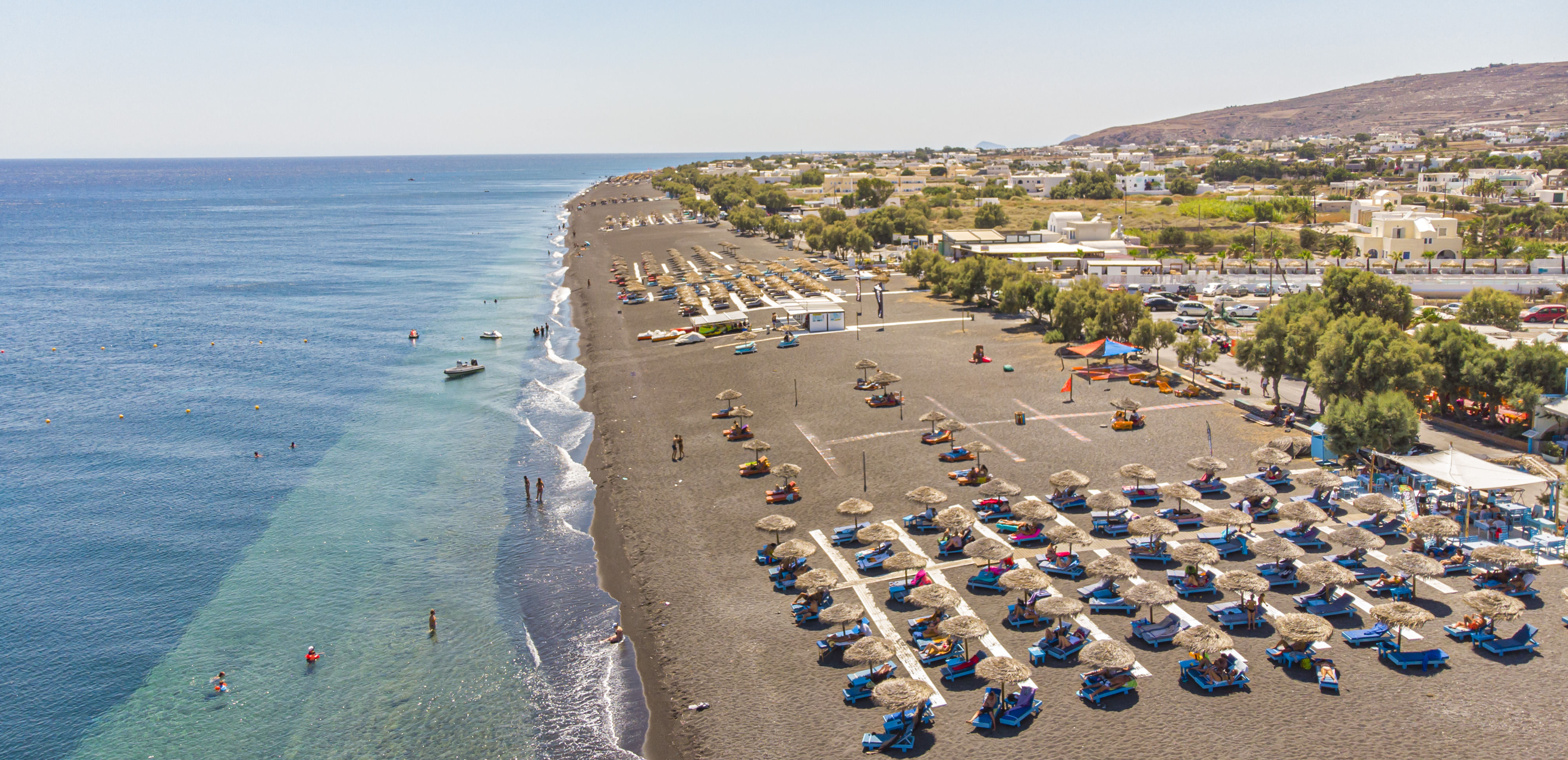 2. Perissa Beach: Enjoy free time to have lunch and relax at one of the longest black sandy beaches in the Cyclades and the most popular beach of Santorini.