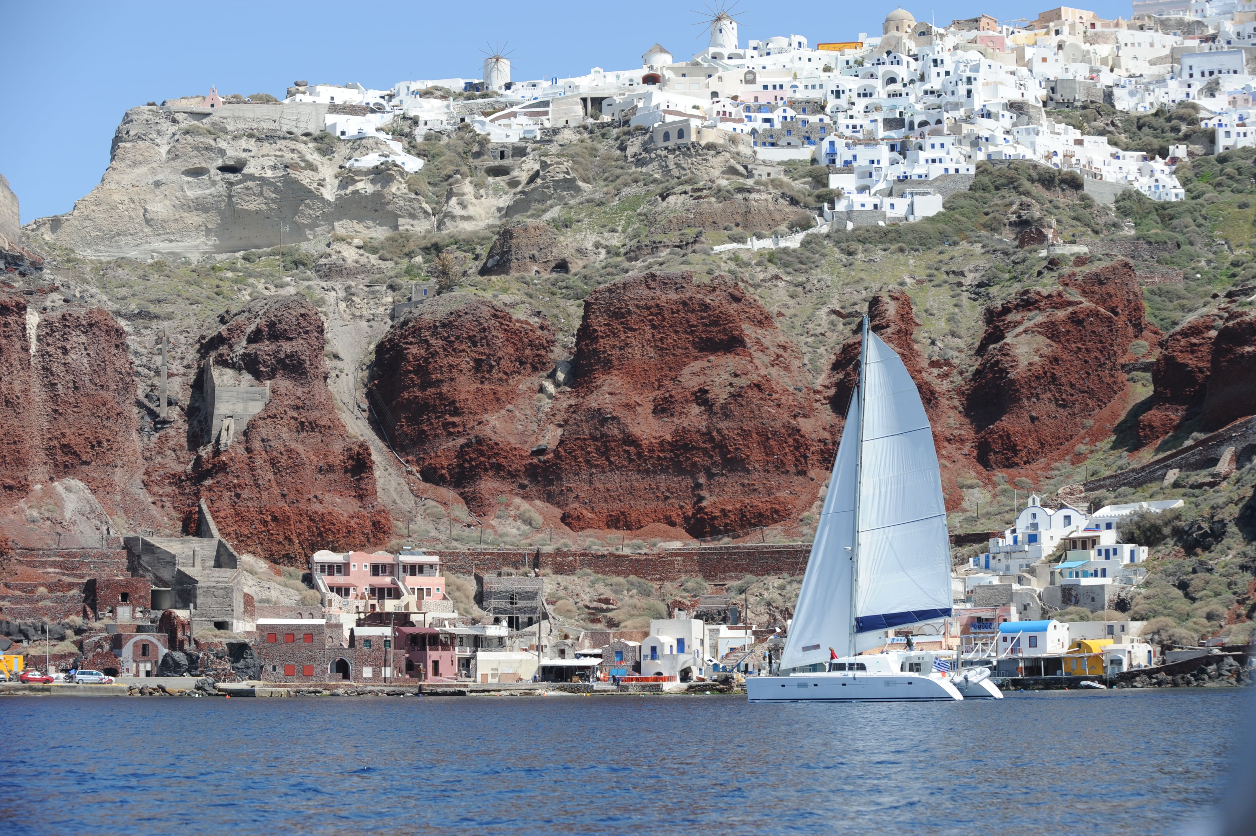 1st stop: Hot Springs for mud bath. Sail past the volcano, Aspronisi, the ancient lighthouse, Akrotiri and Indian Rock.